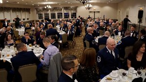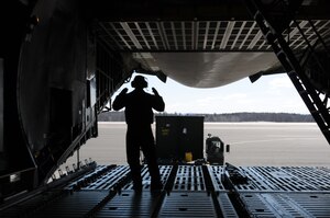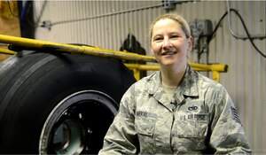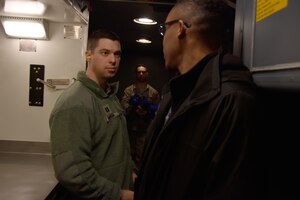 Capt. Victor Traven, a systems and logistics class instructor from Wright Patterson Air Force Base, speaks with civilians inside a C-5 Galaxy parked on the tarmac at Westover Air Reserve Base, Chicopee, Massachusetts, April, 10, 2019. Traven was leading a tour of the cargo plane for civilian