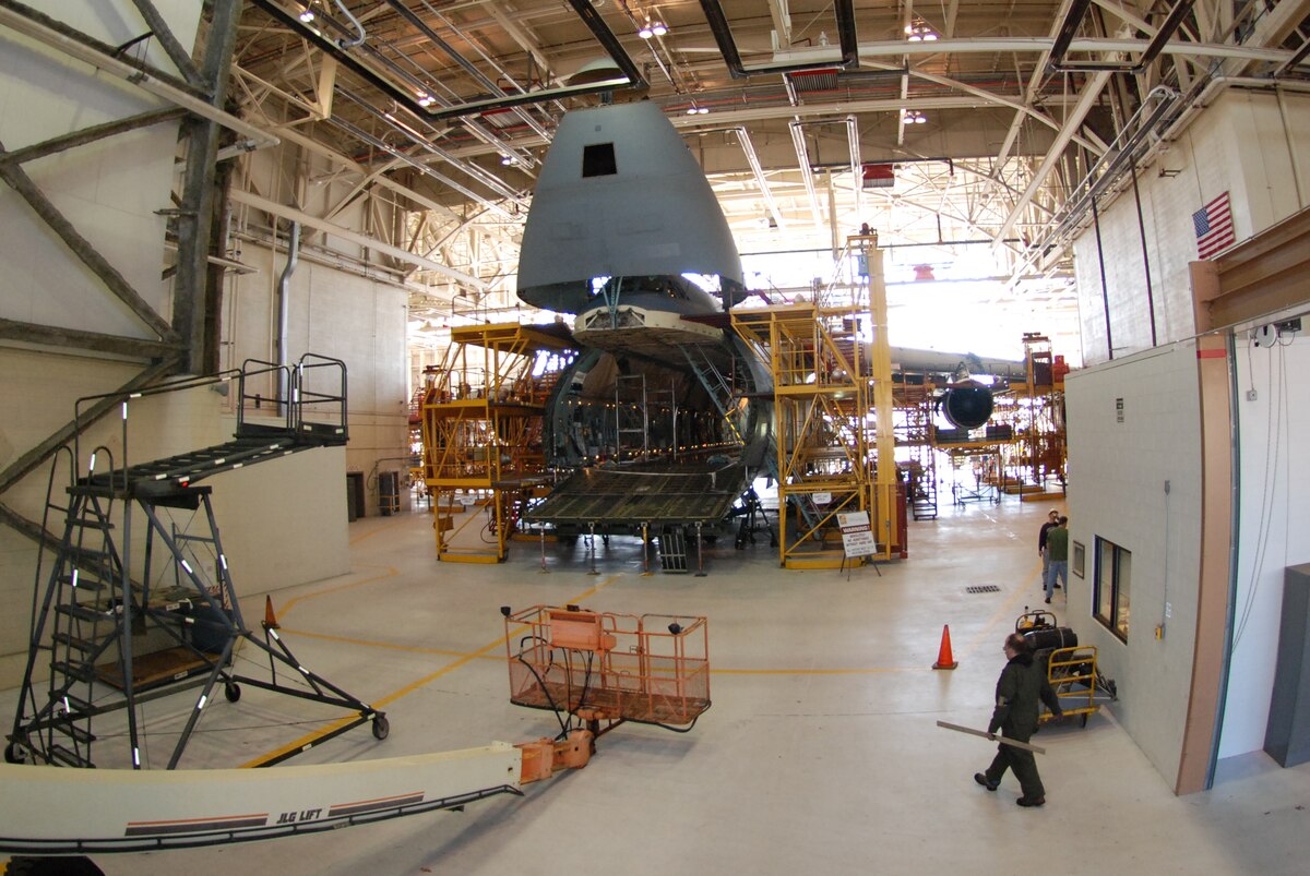 One of Westover's 16 C-5's is inspected inside the isochronical inspection dock. The aircraft is pulled inside the hanger where it is gone over with a fine-tooth comb looking for any faulty components.
